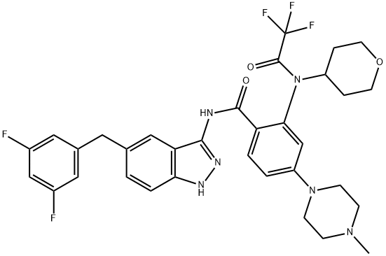 中文名稱: Benzamide, N-[5-[(3,5-difluorophenyl)methyl]-1H-indazol-3-yl]-4-(4-methyl-1-piperazinyl)-2-[(tetrahydro-2H-pyran-4-yl)(2,2,2-trifluoroacetyl)amino]-